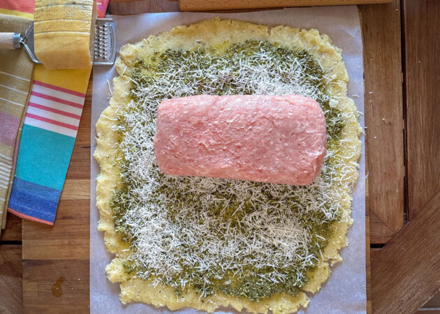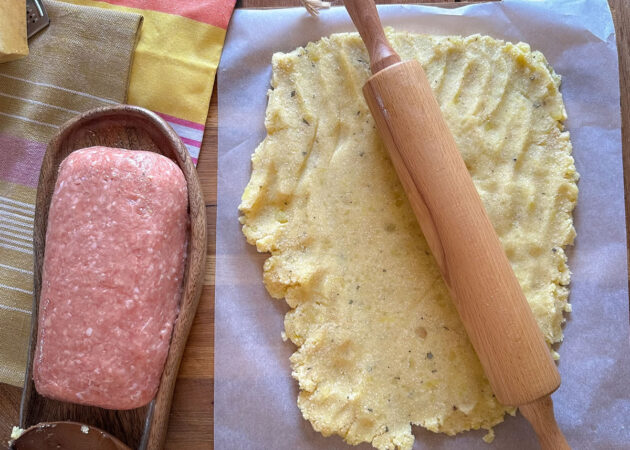 - Prendere un foglio di carta forno e stendere l’impasto di patate in un rettangolo che sia grande abbastanza sa avvolgere l’appetitoso;