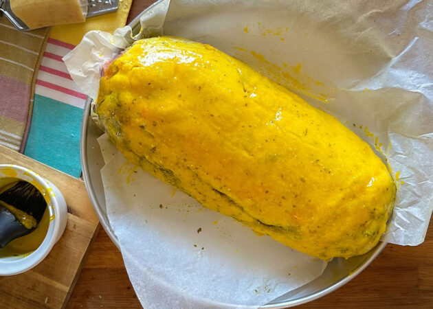 - Spennellare la crosta di patate con un tuorlo d’uovo;