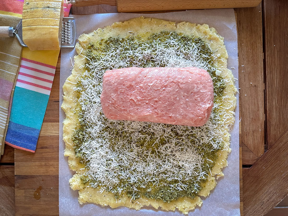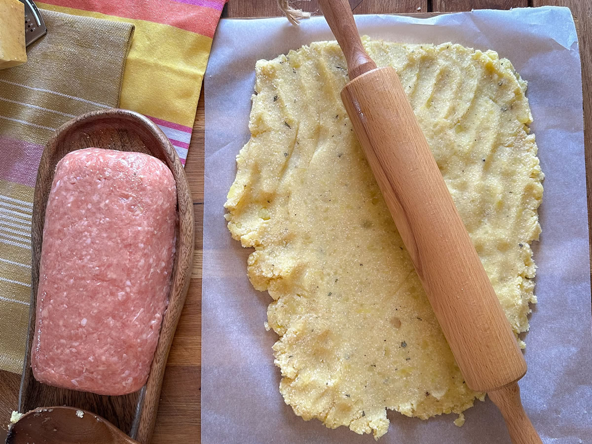 - Prendere un foglio di carta forno e stendere l’impasto di patate in un rettangolo che sia grande abbastanza sa avvolgere l’appetitoso;