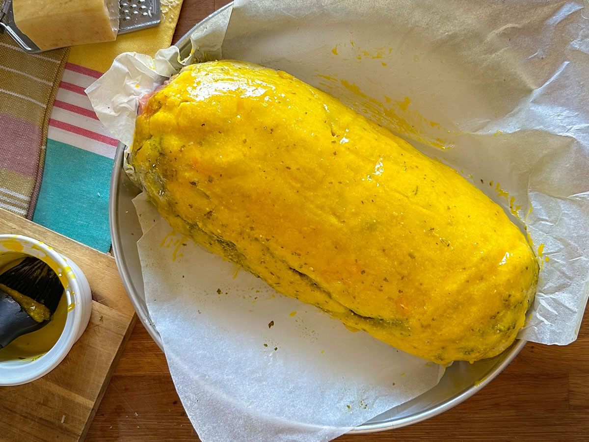 - Spennellare la crosta di patate con un tuorlo d’uovo;