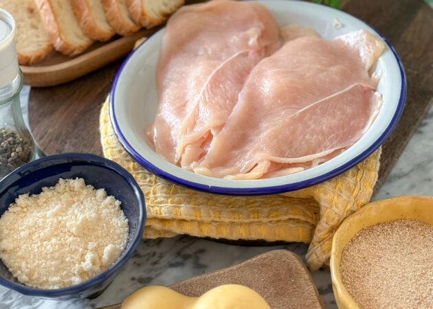 - Passare ogni fettina di pollo nell’olio solo da un lato, il lato che verrà panato;