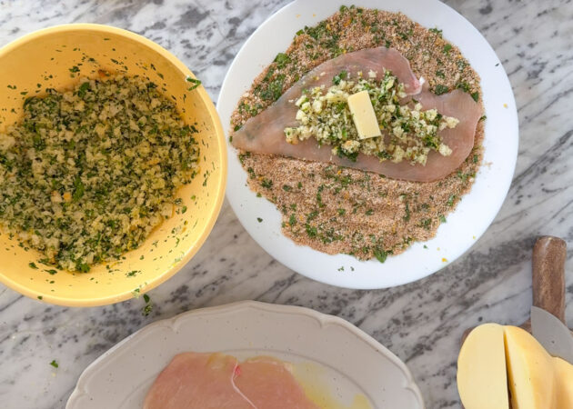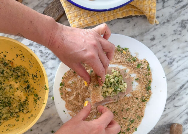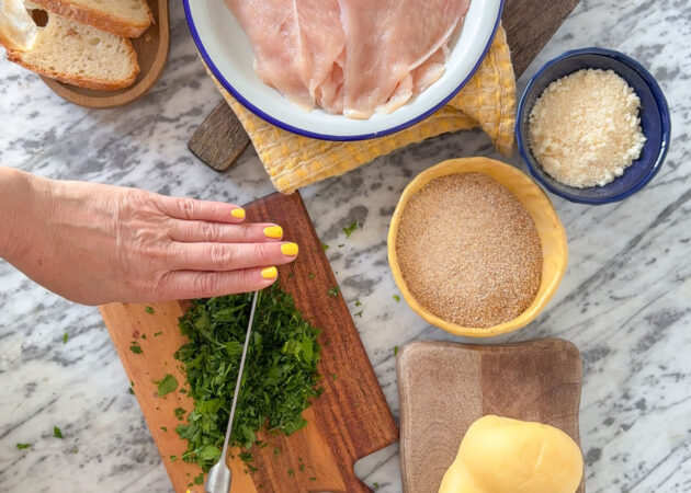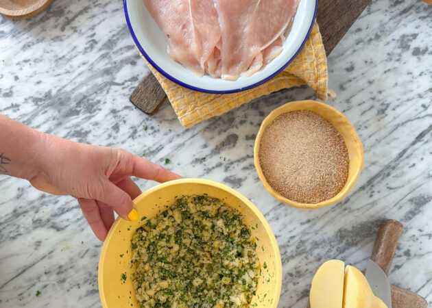 - Preparare la panatura unendo in un piatto il pangrattato, il prezzemolo, il parmigiano e la scorza di limone rimasti;