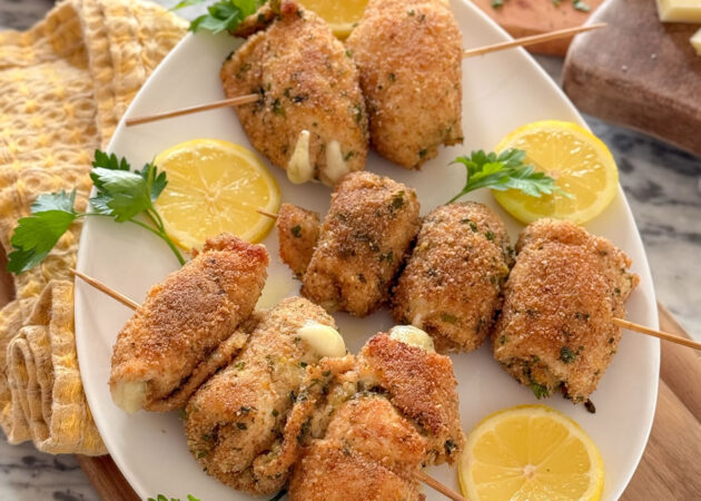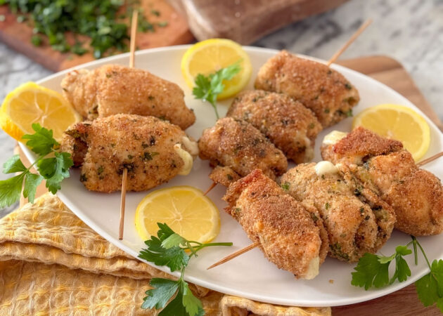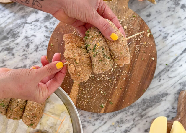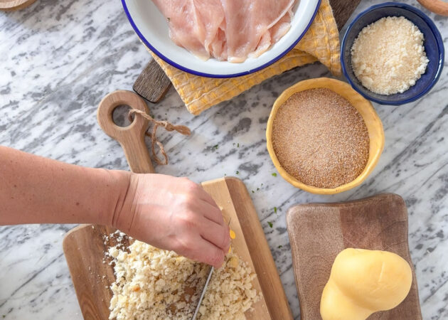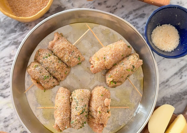 - Ridurre la scamorza a tocchetti su cui andranno arrotolate le fettine di pollo;