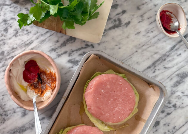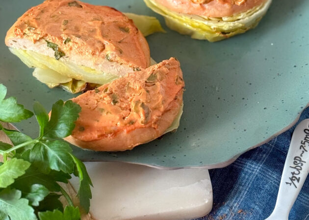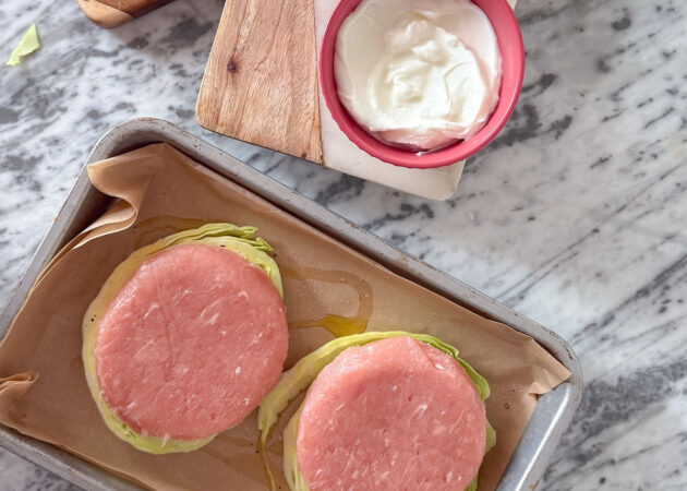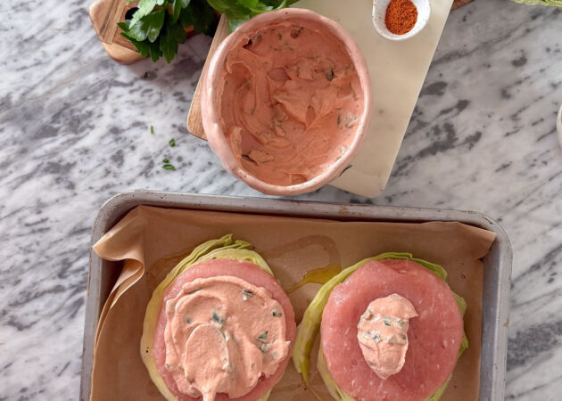 - Coprire ogni hamburger con due cucchiai di salsa;