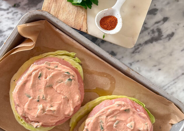 Preriscaldare il forno a 180º; - Preparare la salsa unendo in una ciotola lo yogurt, il concentrato di pomodoro, l’olio, la paprika, il prezzemolo finemente tritato e in ultimo sale e pepe;