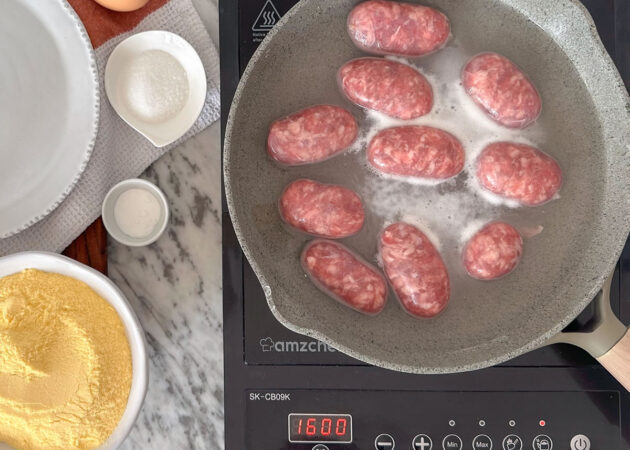 - Mettere in una padella 2 dita d’acqua e aggiungere le salsicce;