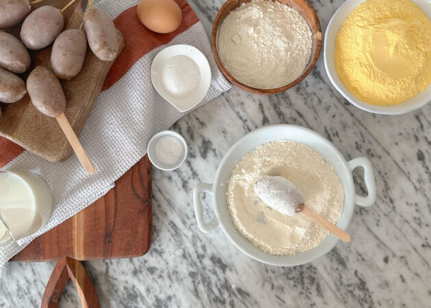 - Preparare la pastella unendo nella ciotola tutti gli ingredienti secchi;