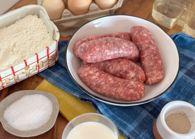 - In una seconda padella versare un filo d’olio e cuocere le salsicce aperte a metà;