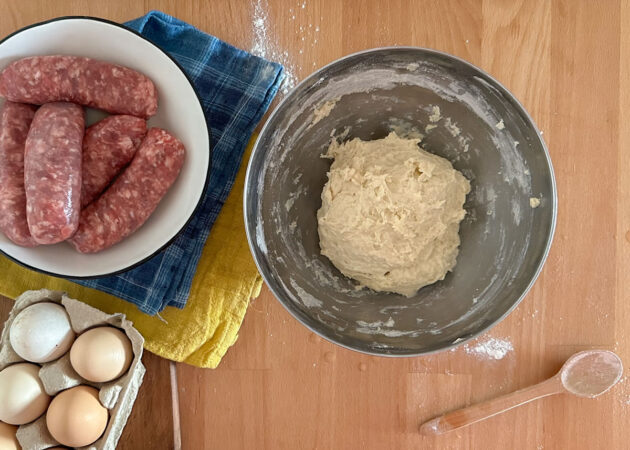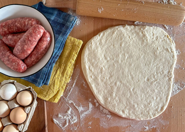 - Riprendere l’impasto e stenderlo con un mattarello sul piano infarinato allo spessore di 2 cm;