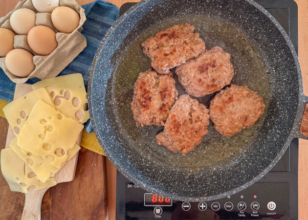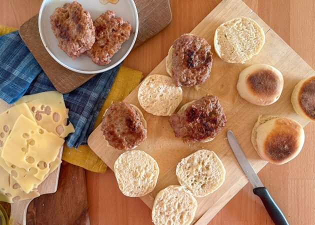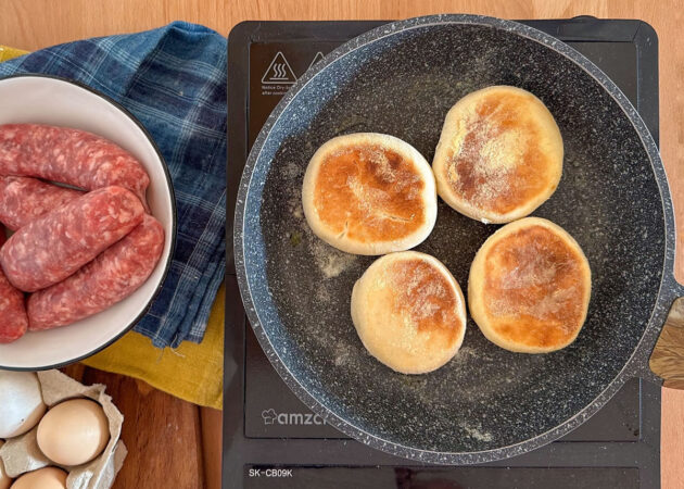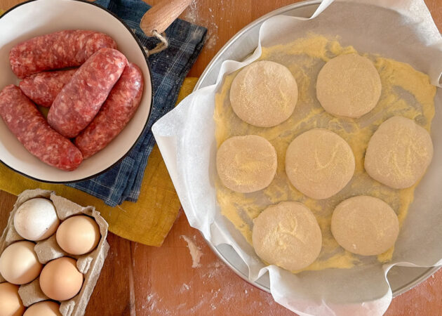 - Aprire i muffins a metà e farcire con la salsiccia, la fetta di emmental e un uovo;