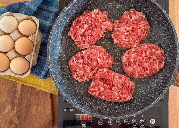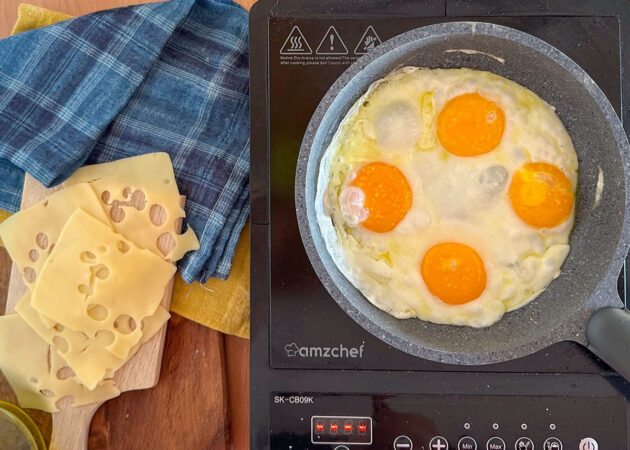 - Preparare le uova all’occhio di bue, salare e pepare;