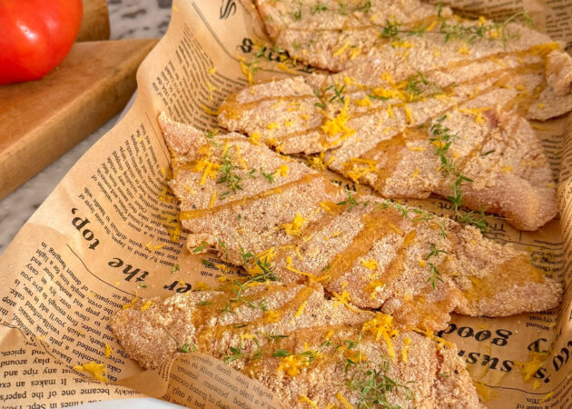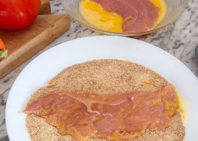 - Panare le fettine di fesa di tacchino passandole prima nell’uovo sbattuto e poi nel pangrattato;