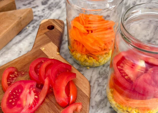 - Prendere i vasetti e iniziare a distribuire all’interno le verdure, partendo dal mais, proseguendo con le carote, i pomodori e i cetrioli;