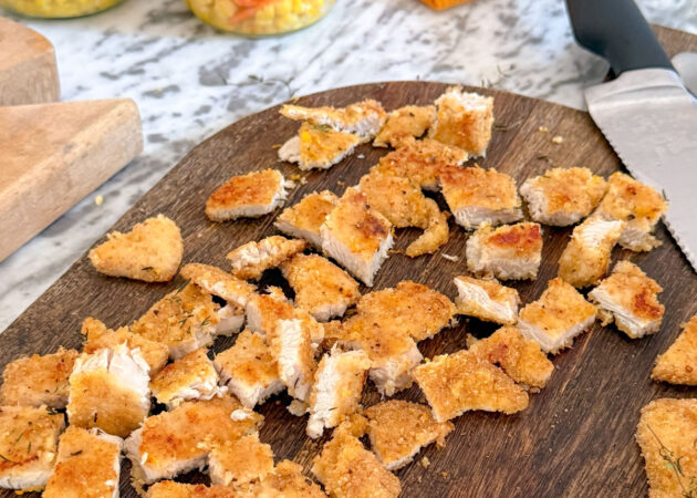 - Sfornare le fettine panate e lasciarle completamente raffreddare, poi ridurle a pezzetti;