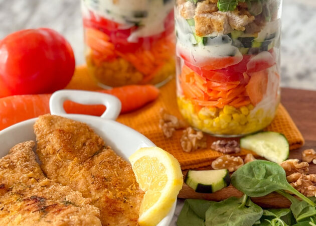 - Riprendere i vasetti, aggiungere la fesa di tacchino , coprire con insalata a piacere (rucola, spinaci freschi…) concludere con qualche gheriglio di noce e chiudere i vasetti;