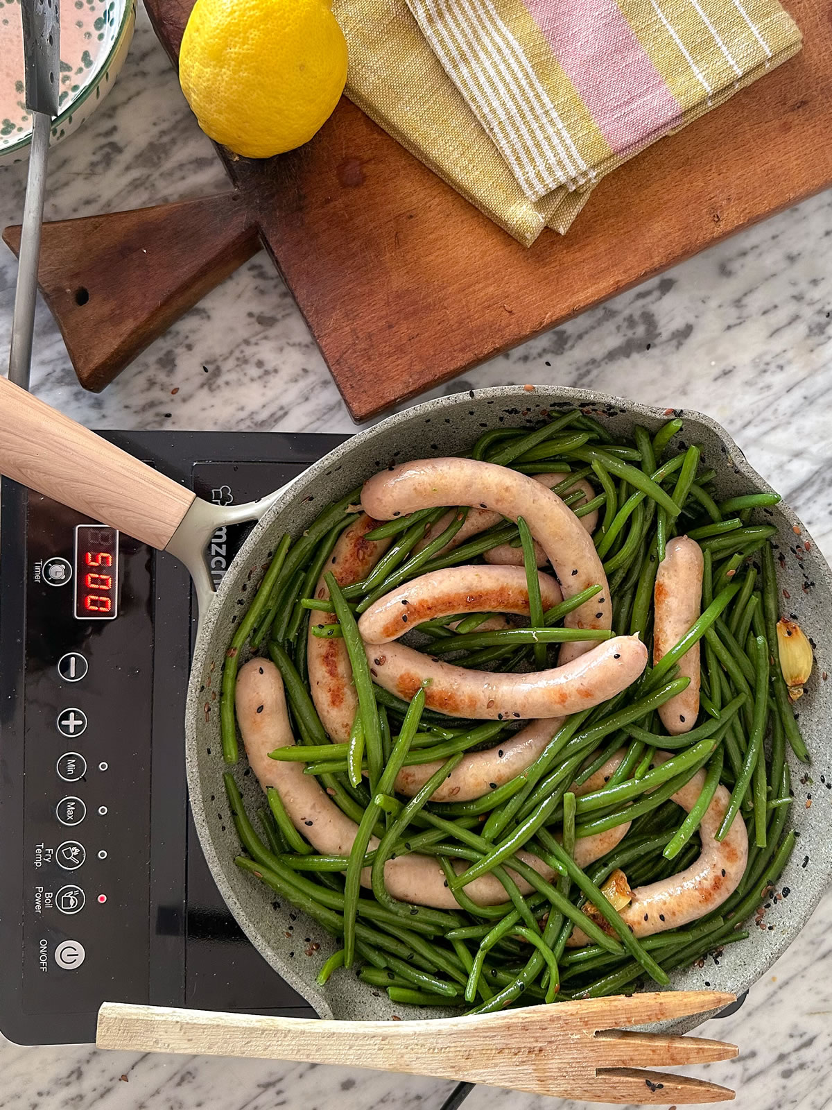 - Rimettere la luganega nella padella con i fagiolini il tempo necessario per riscaldarla;