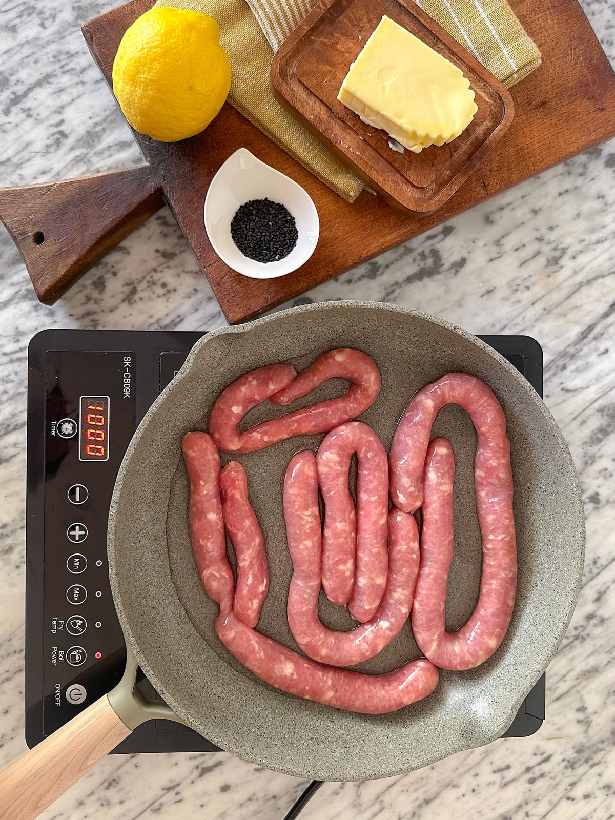 - In una padella antiaderente bollire la luganega in mezzo bicchiere di acqua;