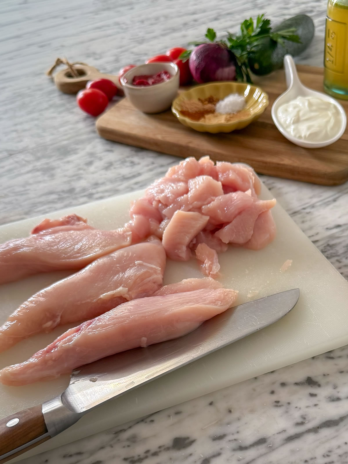 - Ridurre il petto di pollo a tocchetti grossolani;