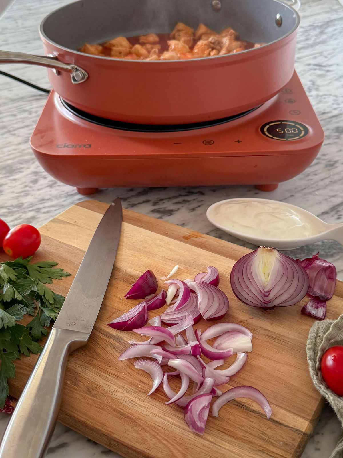 - Nel frattempo ridurre la cipolla a fettine sottili, il cetriolo a cubetti, i pomodorini in quarti e tritare finemente il prezzemolo;