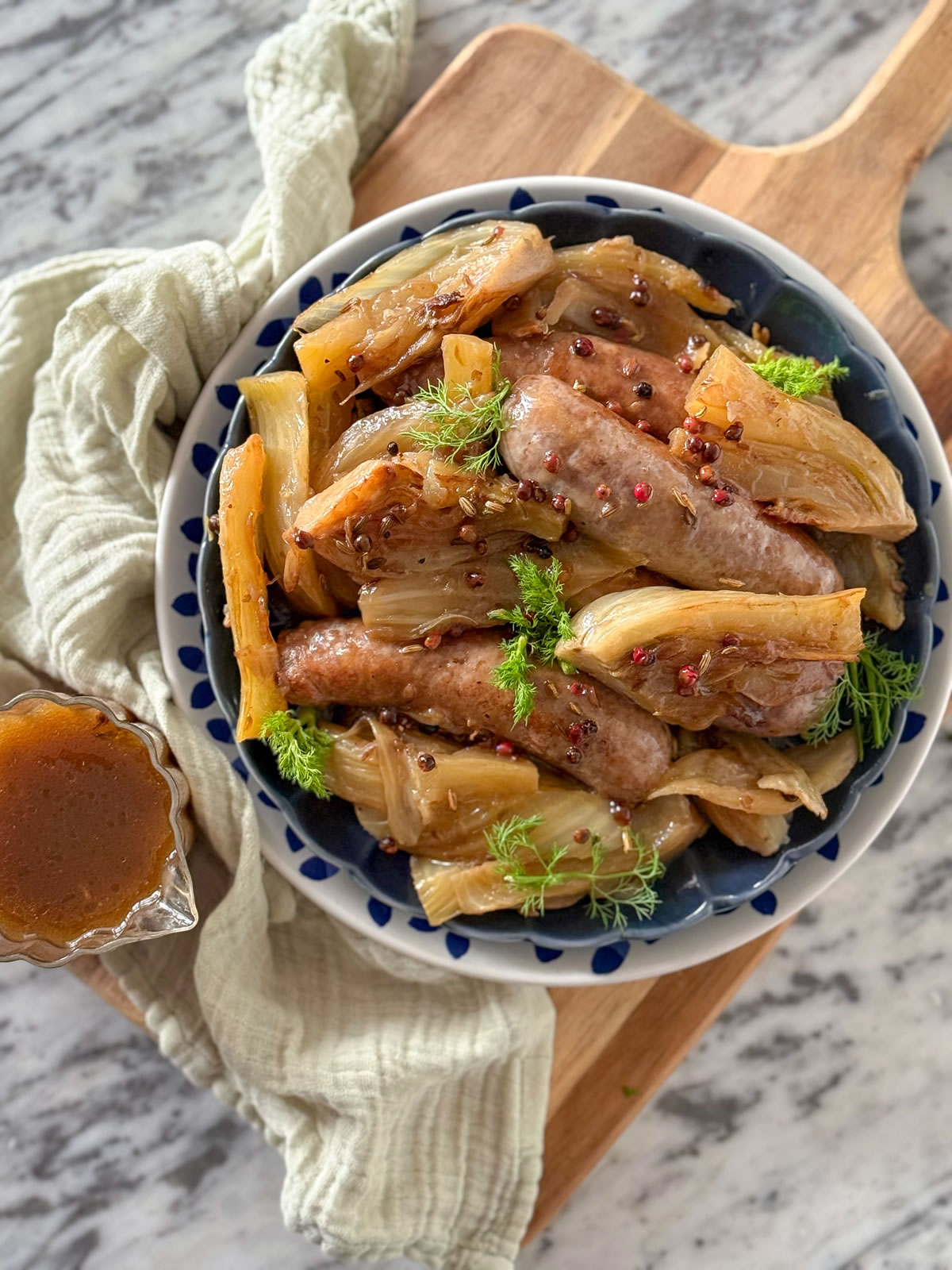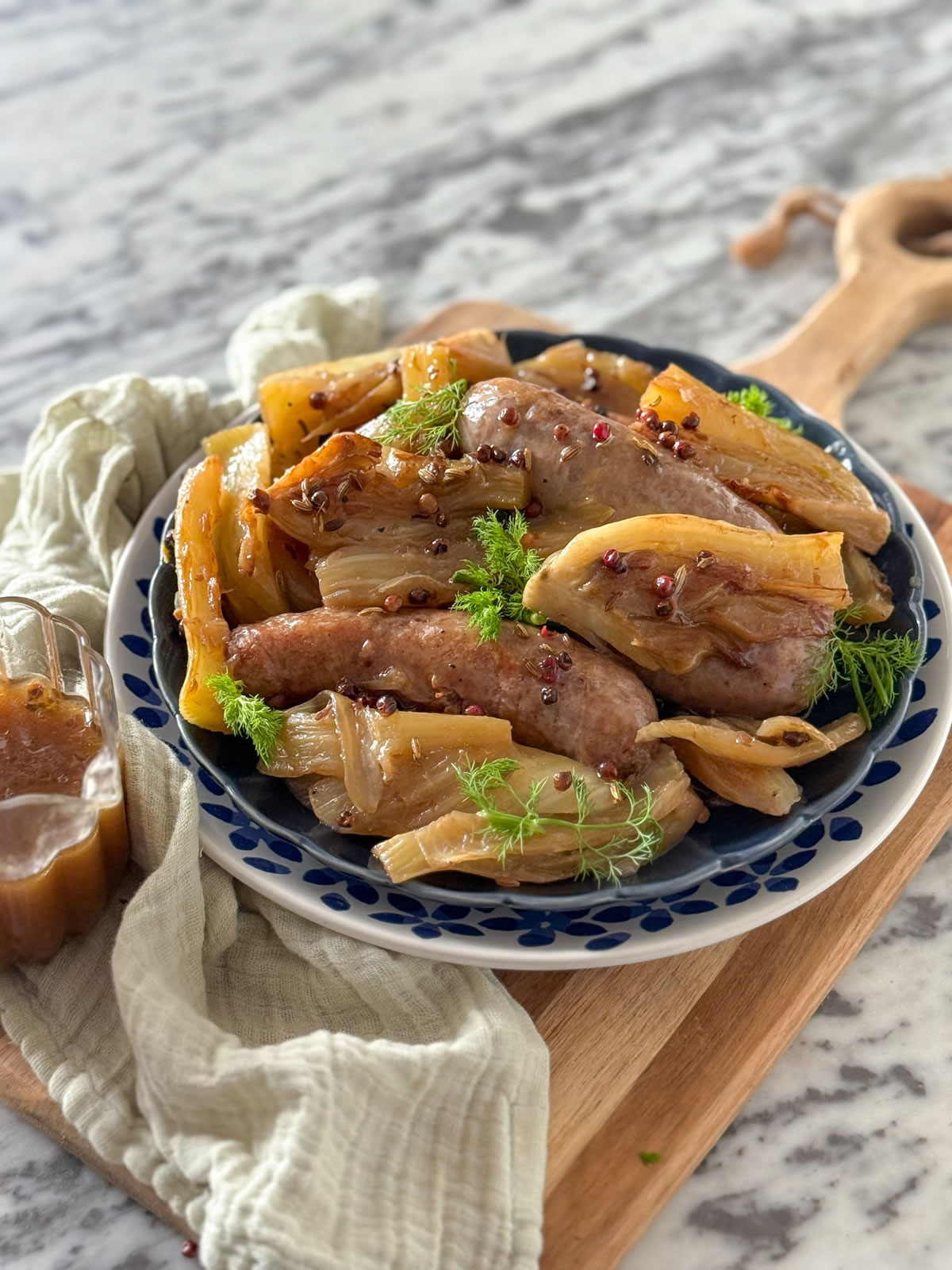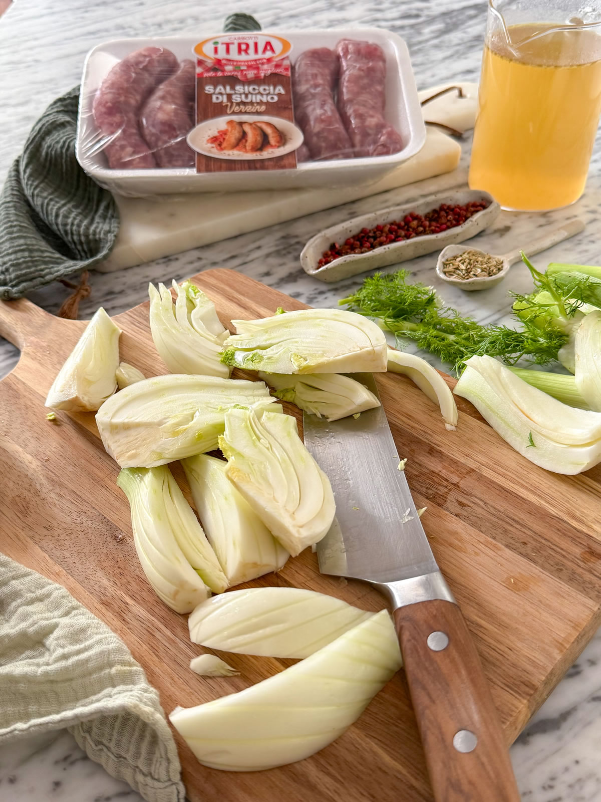 - Togliere il coperchio, rimuovere le salsicce e finocchi e far restringere il fondo di cottura con un cucchiaino di amido di mais;