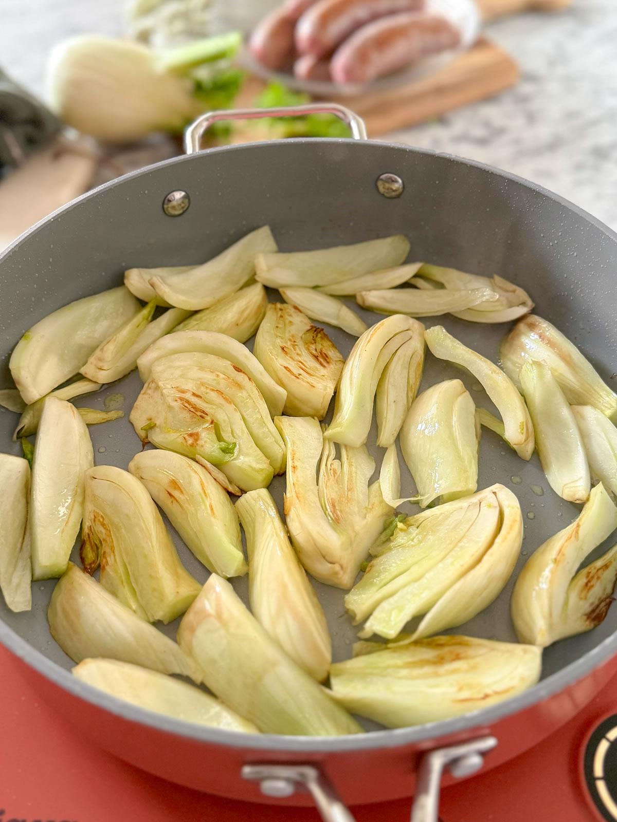 - Aggiungere i finocchi nello stesso fondo di cottura e brasarli fino a dorarli bene da entrambi i lati;