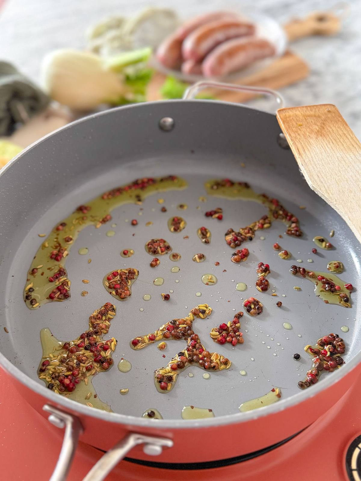 - Mescolare brevemente e unire nuovamente nel tegame salcicce e finocchi;