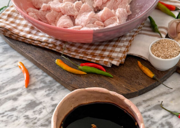 - Preparare la salsa versando in una ciotola la soia, l’acqua e lo zucchero di canna;