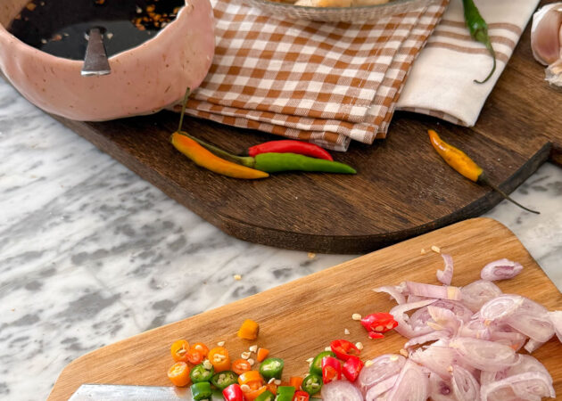 - Ridurre lo scalogno e il peperoncino a rondelle sottili;
