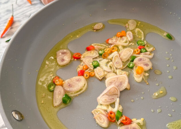 - Rimettere la padella sul fuoco, aggiungere lo scalogno e il peperoncino e saltare per un paio di minuti;