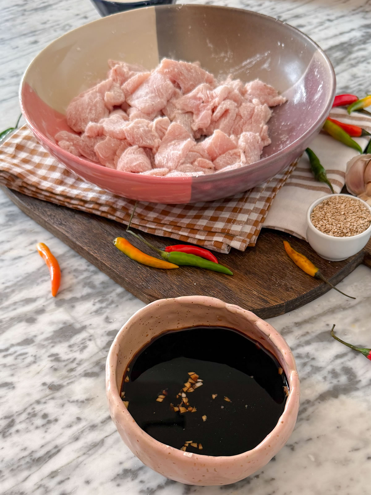 - Preparare la salsa versando in una ciotola la soia, l’acqua e lo zucchero di canna;